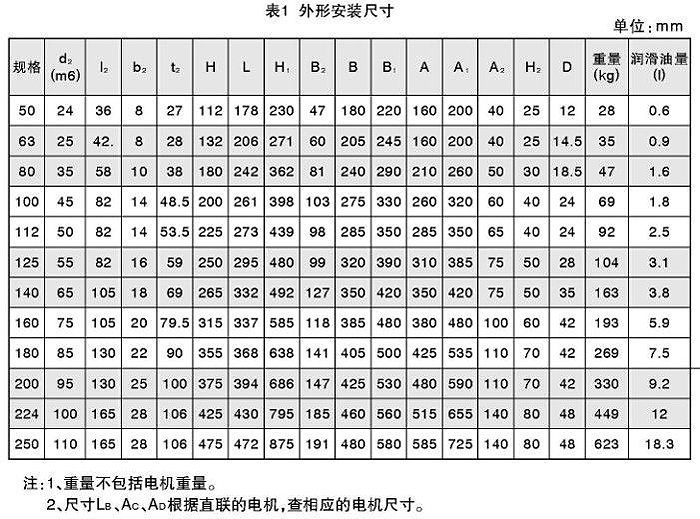 減速器的外形尺寸如圖1、表1、表2。