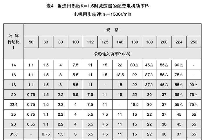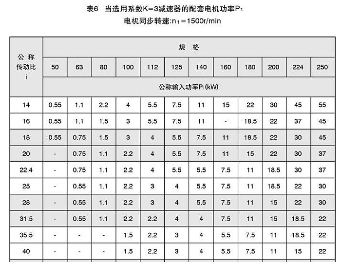對一般重要程度,選用批量不大,連續運輸的減速器:均勻載荷K=1.5:中等沖擊載荷K=2;強沖擊載荷K=3。確定選用系數K,根據輸入電機功率和要求的傳動比i,從表4、5、6中選定減速器。