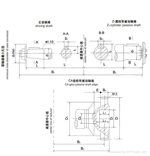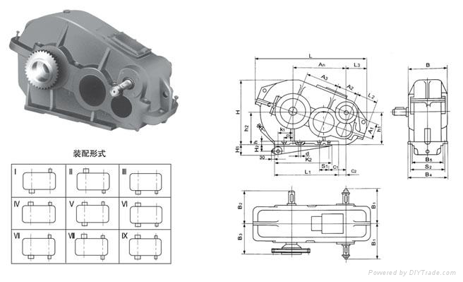 ZQ1000+250大速比齒輪減速機(jī)重約為2189kg,高速軸直徑為70,出軸長度為110,主軸直徑為160,出軸型式有:圓柱形被動(dòng)軸端,CA齒輪形被動(dòng)軸端。有九種裝配型式。