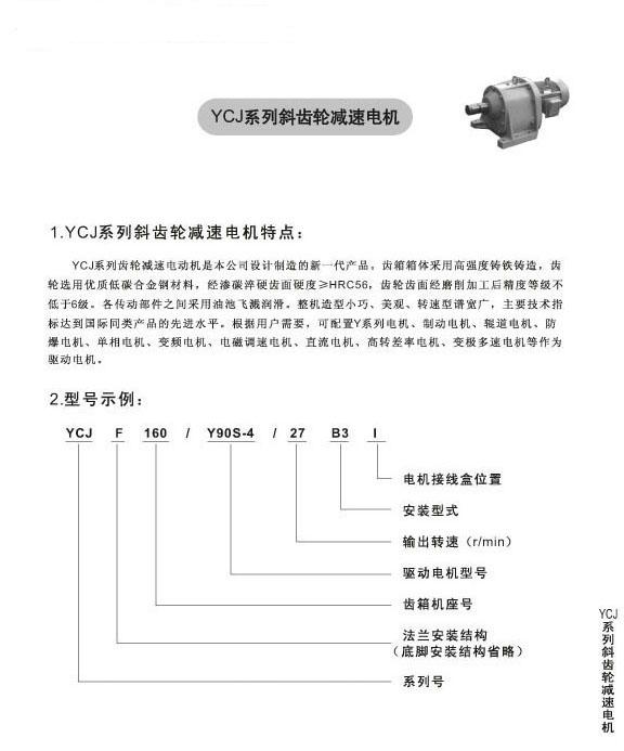YCJ系列齒輪電機是按照JB/T6442-92設計制造的新一代產品,本系列產品屬國內先進產品。主要技術指標達到國際同類產品的先進水平,并根據用戶需要,,可配置制動電機、輥道電機、防爆電機、單相電機、變頻電機等各類電機