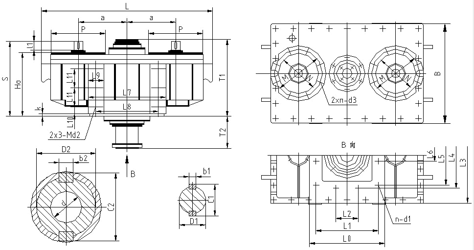 單級三環傳動;二高速軸平行對稱位于低速軸兩側,各軸垂直地面,箱體平置,座裝,端面剖分;附加標號P