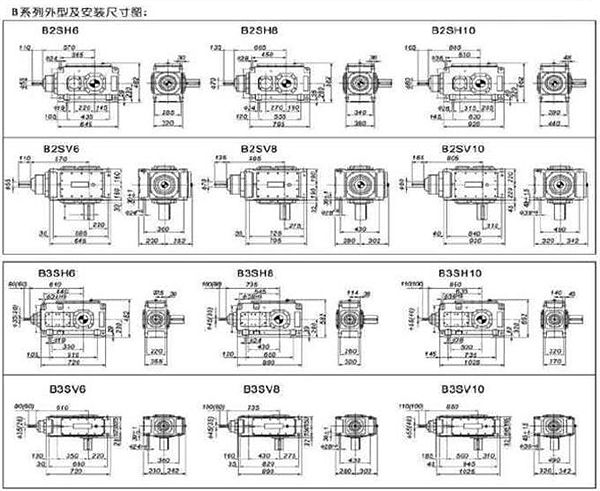 7.H、B系列產(chǎn)品有3~26型規(guī)格,減速傳動級數(shù)有1~4級,速 比1.25~450;和我廠R、K、S系列組合得到更大的速比。